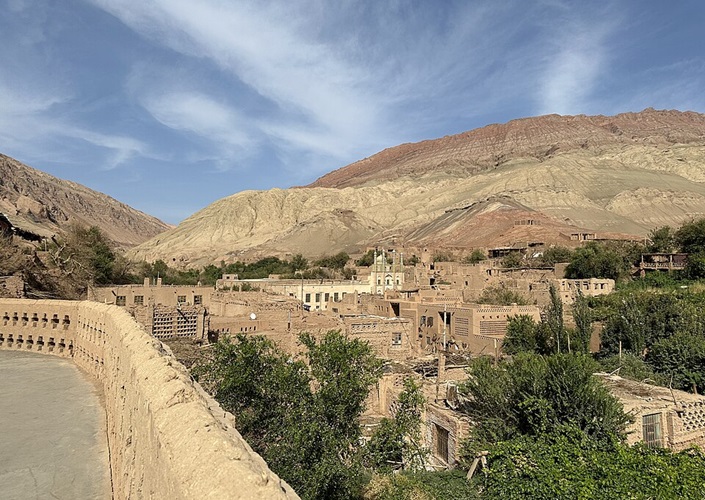 Siedlung bei Turpan, wo mit 15 mm (pro Jahr) ein Regenrminimum von Städten in Asien vorherrscht, China