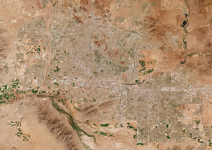 Satellitenaufnahme von Phoenix, mit 180 mm (pro Jahr) ein Regenrminimum in Nordamerika, Arizona, Vereinigte Staaten