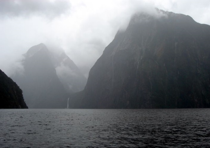 Milford Sound, mit 6.430 mm (pro Jahr) ein Regenrekord von Orten in Ozeanien – außerhalb von Hawaii, Südinsel, Neuseeland