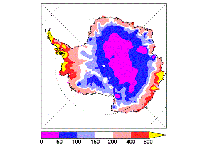 Karte des durchschnittlichen jährlichen Niederschlags, bei 50 mm (pro Jahr) ein Schneefallminimum in Antarktika (inneres Eisplateau)