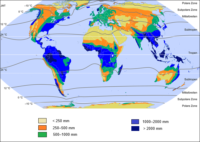 Globale Verteilung der jährlichen Niederschlagssummen in fünf Clustern (mit vegetationskundlichem Bezug)