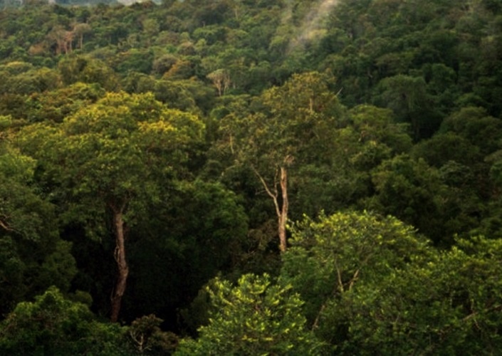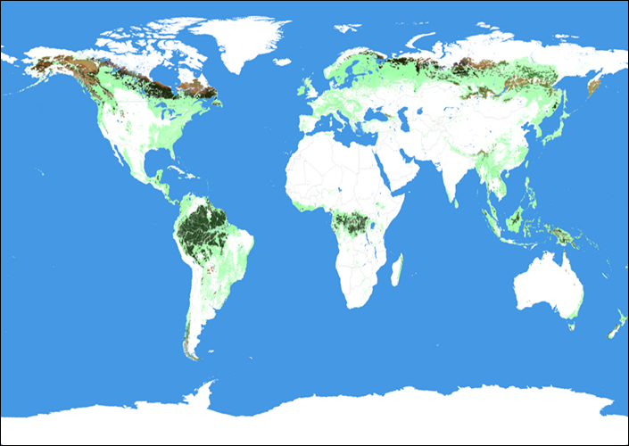 Intakte Waldlandschaften (kräftige Farben) innerhalb der waldbedeckten Gebiete der Erde (2000, hellgrüne Töne)
