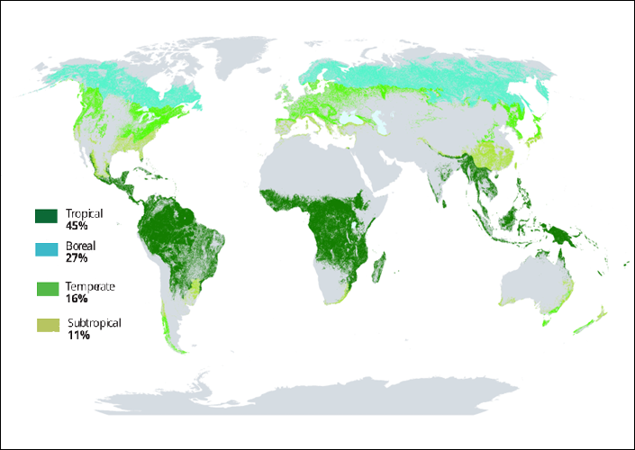 Anteil und Verteilung der globalen Waldfläche nach Klimagebieten
