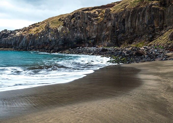 Boden als Sand, als Steine, als Felsen: Prainha Beach auf Madeira (Portugal)