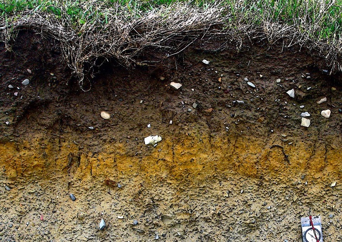 Stagnogley (Molkenboden), Anschnitt eines Stauwasserbodens mit stark gebleichtem Oberboden, irgendwo