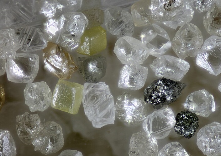 Diamant, kubische Modifikation des Kohlenstoffs, Rohdiamanten in verschiedenen Kristallformen und Farben, Fundort Russland