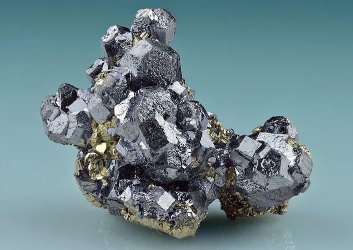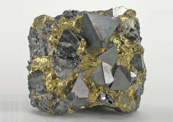 Magnetit (Magneteisenstein), sehr häufig vorkommendes Mineral, hier Oktaeder (silbern) auf Chalkopyrit (golden) aus Südafrika