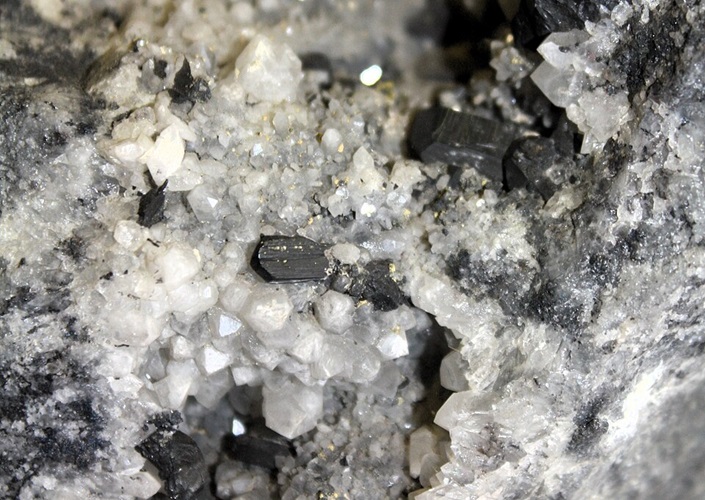 Miargyrit, selten vorkommendes Mineral, chemisch Silber-Antimon-Sulfid, hier schwarz mit Quarz (weiß) aus Sachsen, Deutschland