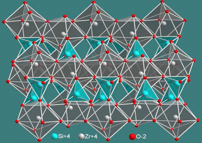 Zirkon, ein Inselsilikat, Struktur mit (inselartigen) SiO4-Tetraedern und kanten-verknüpften ZrO8-Dodekaedern