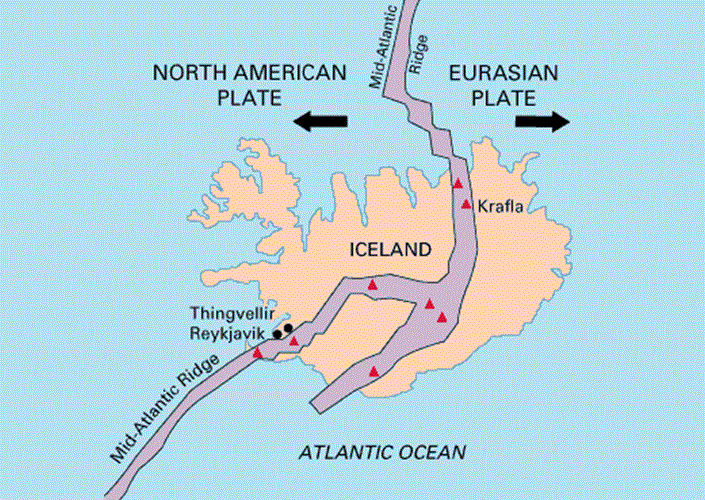 Karte des Mittelatlantischen Rückens mit Teilung in Island, Aufspreizung der Nordamerikanischen und Eurasischen Platte