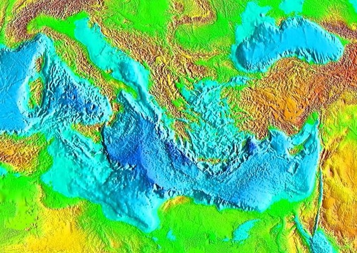 Reliefkarte des (östlichen) Mittelmeers und Schwarzen Meers – Rücken, Berge und Abhänge erkennbar