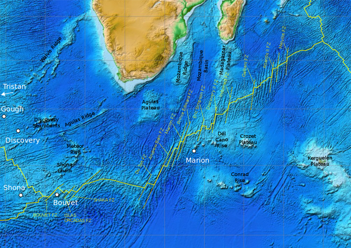 Südwestindischer Rücken zwischen Antarktischer und Afrikanischer Platte, im Osten über in Zentralindischen Rücken