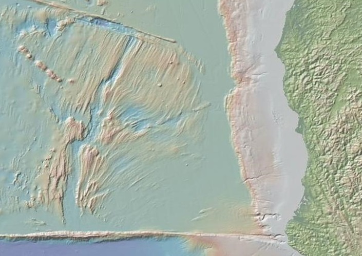 Bathymetrischs Bild des Gorda-Rückens (links, unten Mendocino-Bruchzone), westlich von Kalifornien, Vereinigte Staaten