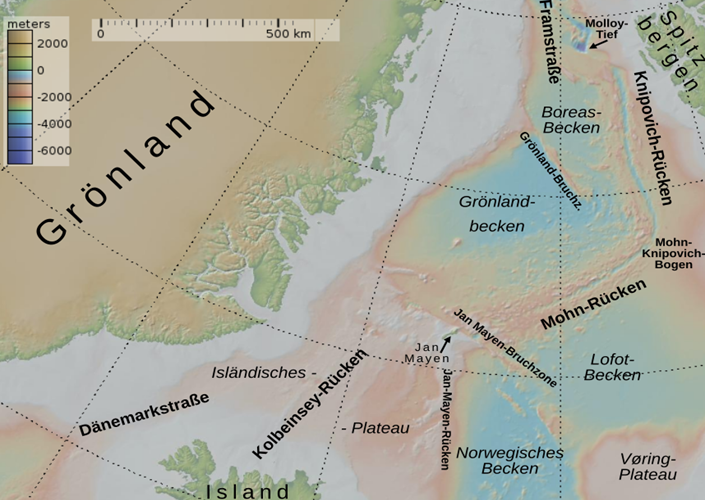 Topographie des Ozeanbodens der Grönländischen See und Umgebung, Mohn-Rücken und Knipovich-Rücken rechts