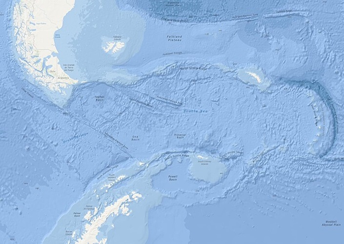 Bathymetrische Karte der Scotia-Platte mit ihren begrenzenden untermeerischen Rücken