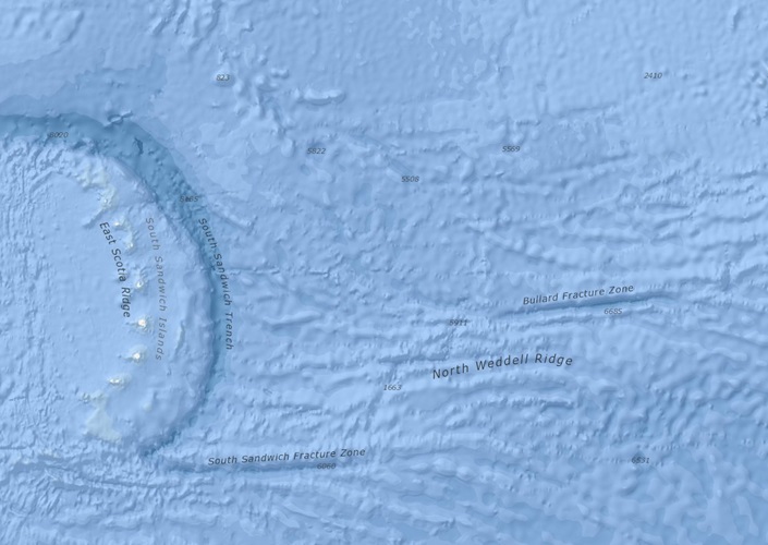Bathymetrische Karte des mittelozeanischen Amerikanisch-Antarktischen Rückens (North Weddell Ridge)