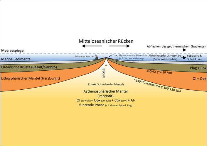 Schematische Darstellung eines mittelozeanischen Rückens (petrologische Prozesse)