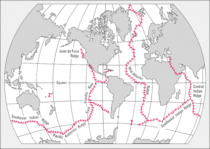 Verlauf der mittelozeanischen Rücken auf einer Weltkarte