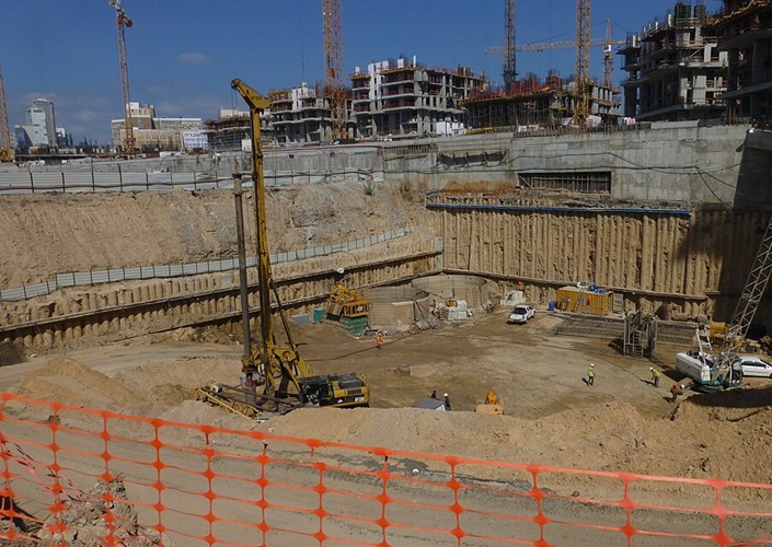Großräumiger Aushub von Boden für eine Baustelle, seitlicher Verbau zur Absicherung, Begin Road, Tel Aviv, Israel