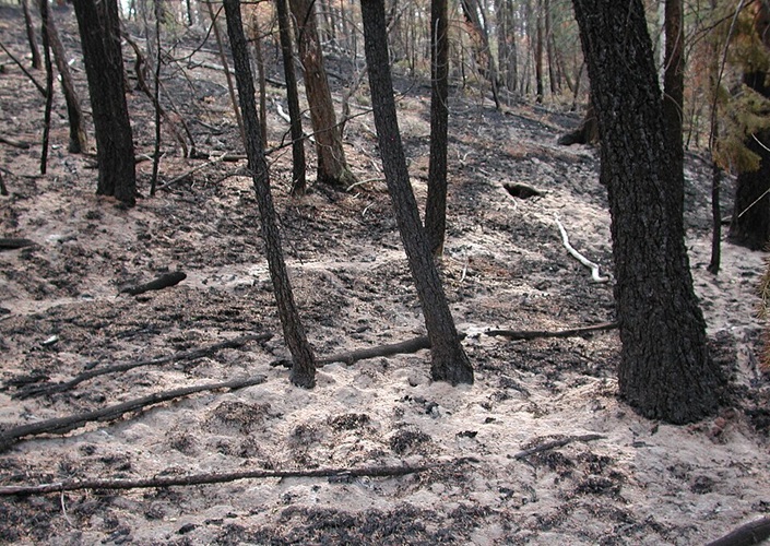 Waldboden nach Brand im „Hayman-Feuer“ (Geisterstadt Hayman), nahe Pikes Peak, Colorado, Vereinigte Staaten