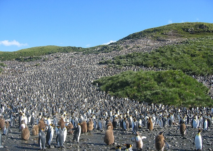 Belebter Boden: etwa 60.000 Brutpaare von Königspinguinen bei Salisbury Plain auf Südgeorgien, Antarktis