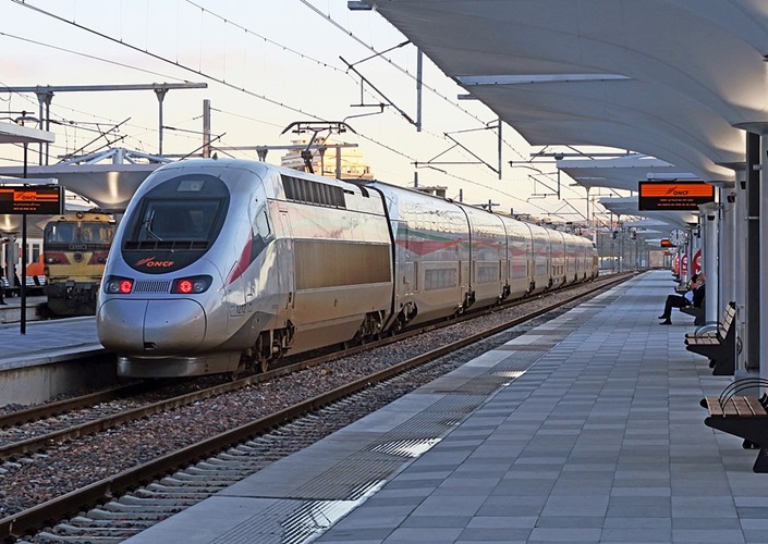 LGV Tanger–Kenitra (2018), erste Schnellfahrstrecke des Kontinents (350 km/h), TGV-Zug im Bahnhof Tanger-Ville, Marokko