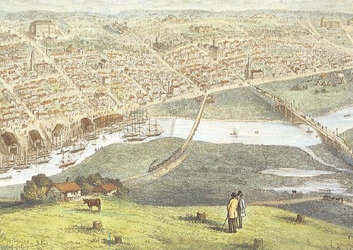 Sandrige Rail Line in der Bildmitte, erste Passagiereisenbahnstrecke Australiens, zwischen Melbourne und dem Vorort Sandridge (1854)
