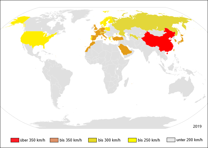 Weltkarte der Länder mit Schnellfahrstrecken (Hochgeschwindigkeitsverkehr)